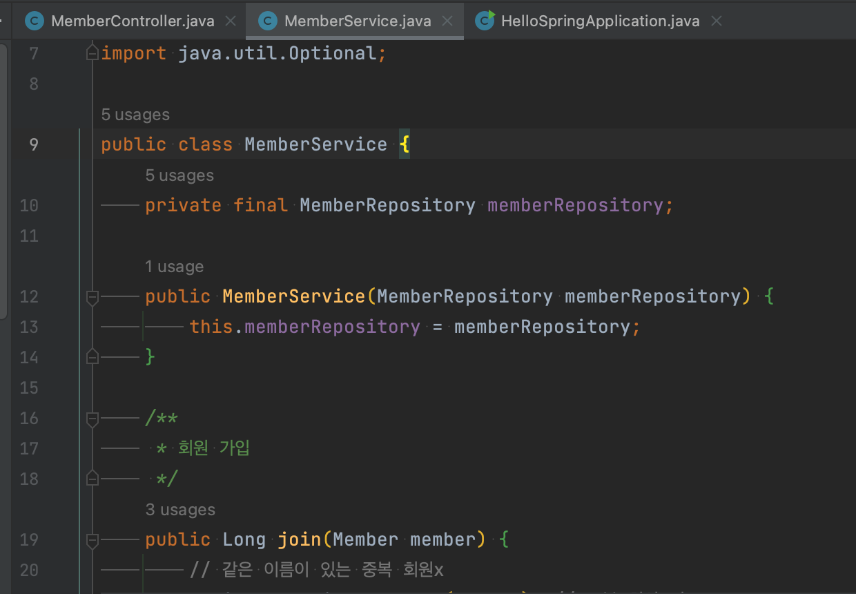 new MemberService() 로 하면 MemberController 말고 다른 여러 controller들이 MemberService 가져다 쓸 수 있음.