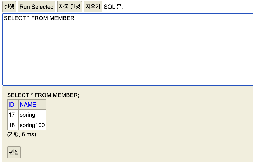 위의 test join 에서 setName에 name을 spring100으로 변경해 다시 실행