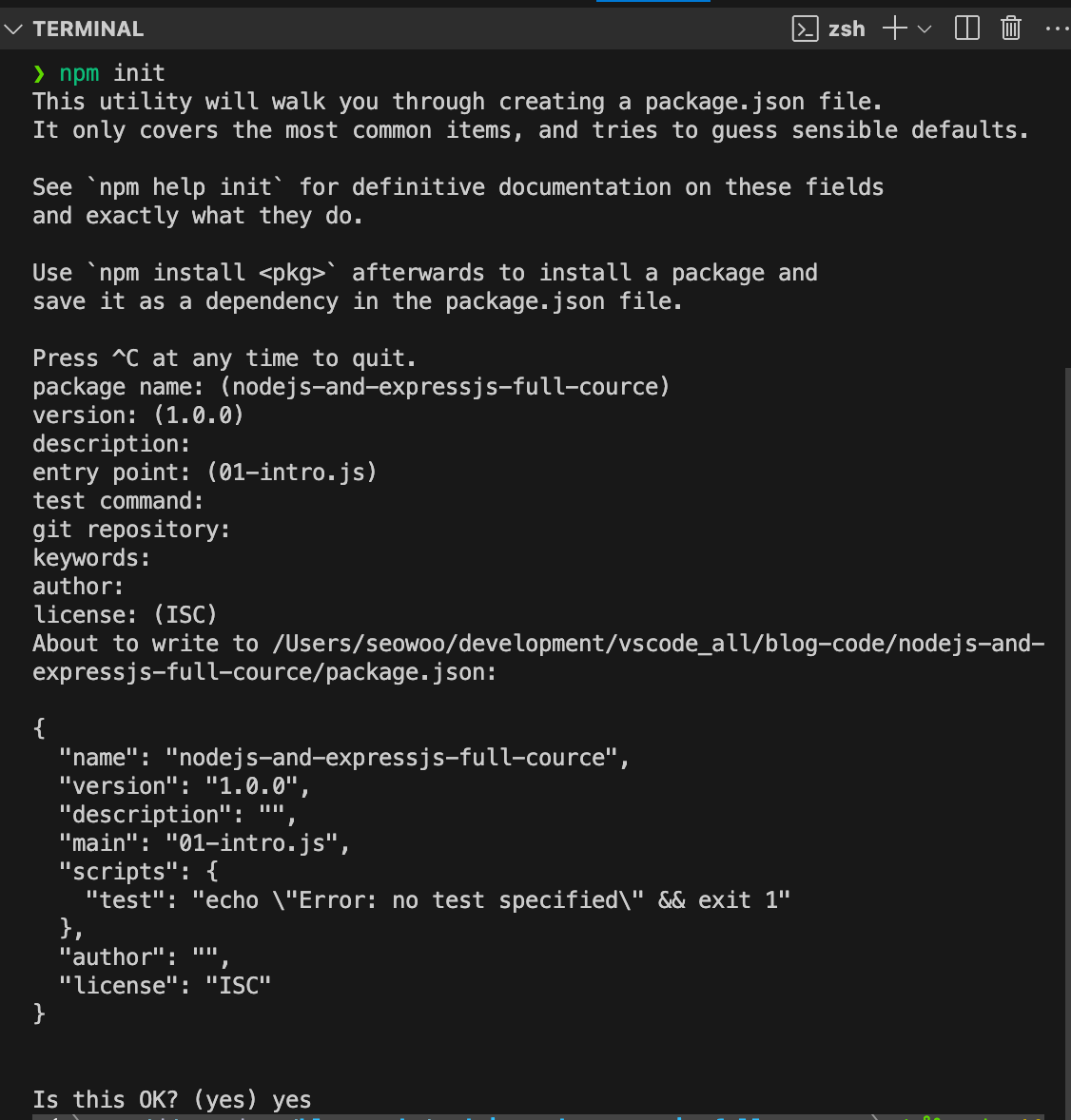 package.json 생성됨
