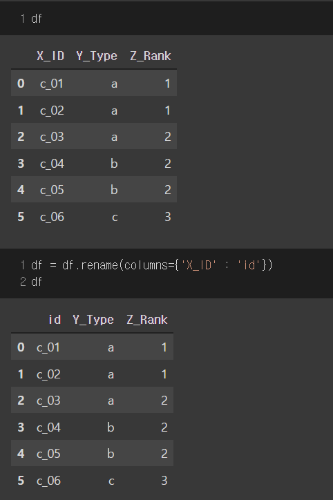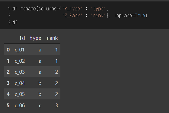 inplace=True 옵션을 추가하면 df.rename으로 변경된 column명이 df에 적용된다.
