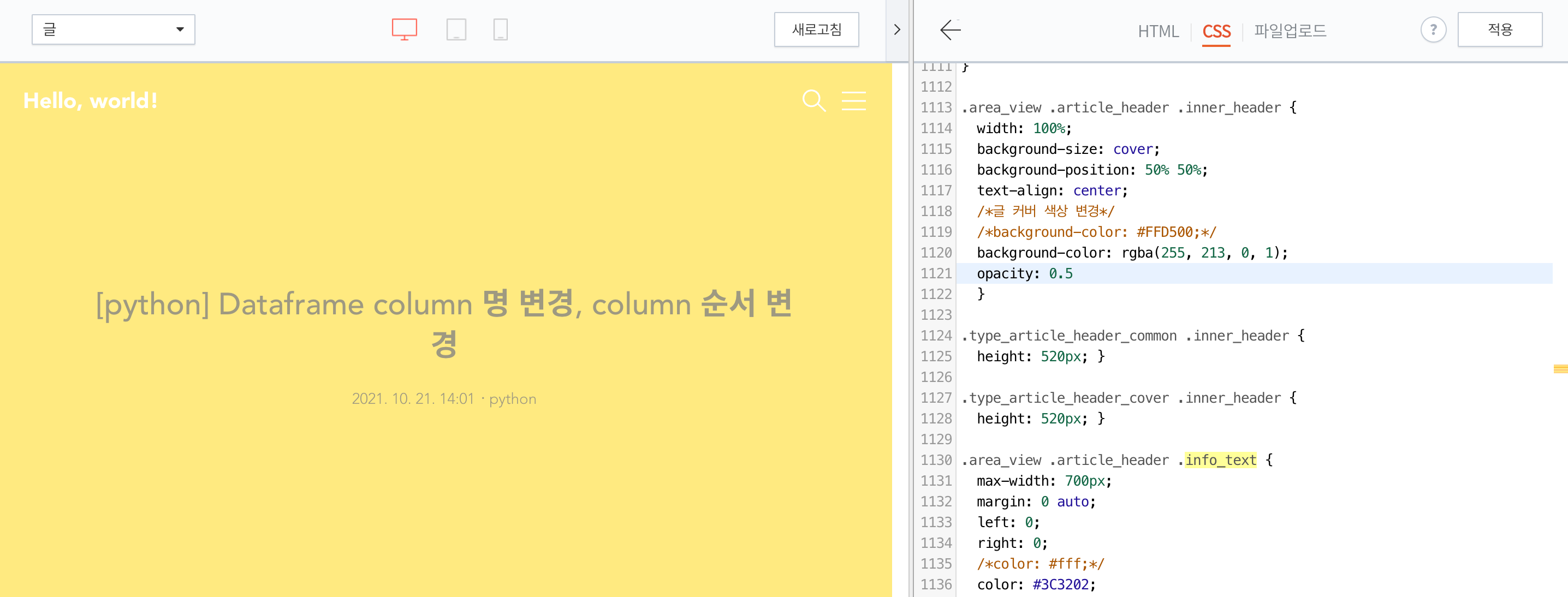 티스토리 스킨 제목 배경색에 투명도를 적용하고 싶으면 rgba를 사용하는게 낫겠다.
