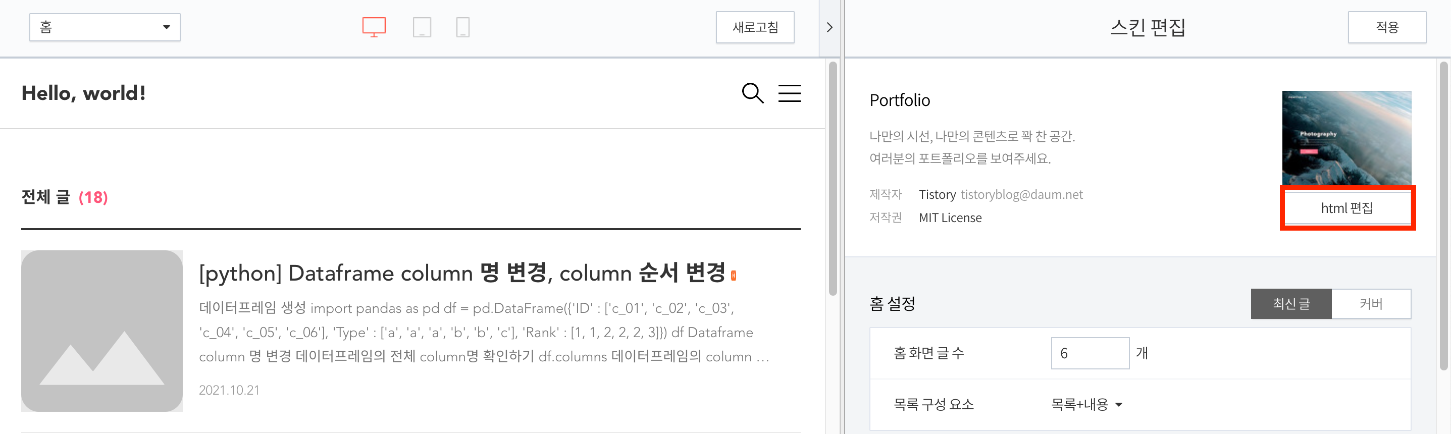 | [티스토리 스킨] Portfolio 스킨 리스트 사진 삭제하기 (1) | 2021.10.27 |