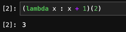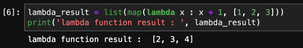 lambda_result = list(map(lambda x : x + 1, [1, 2, 3]))
