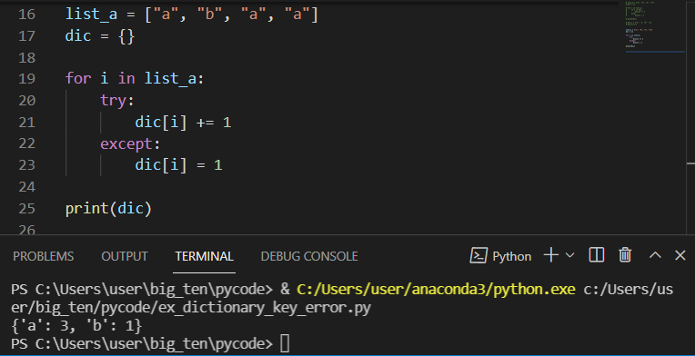 이때 처음에는 dictionary가 비어 있기 때문에 dictionary에 key가 존재하는지 if문으로 비교하여 count를 증가 시킨다.