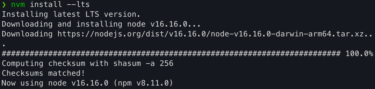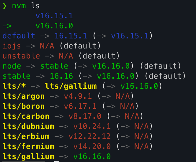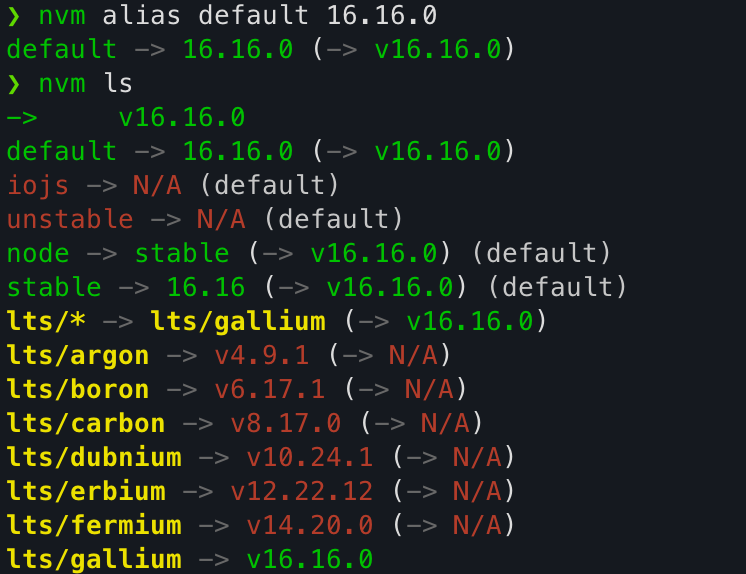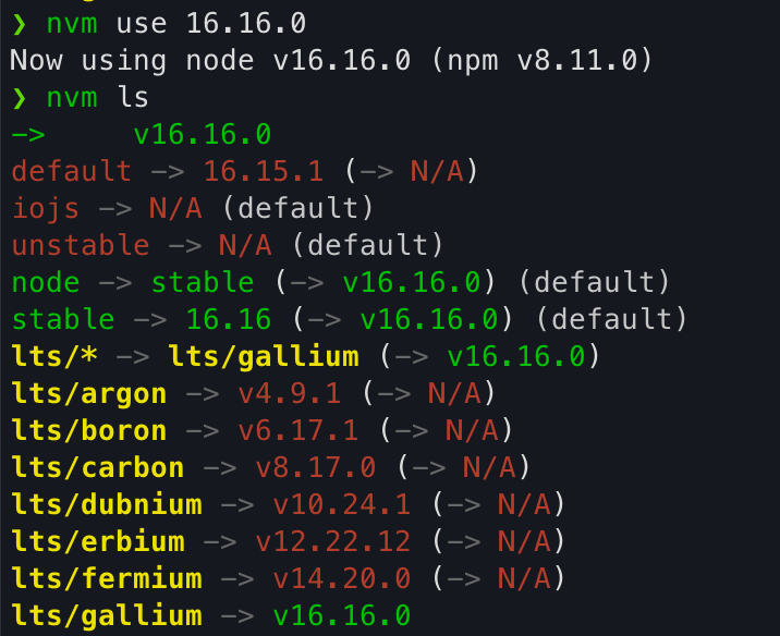 default node.js 버전 사용하기 (여기선 16.16.0 버전), node.js 리스트 확인