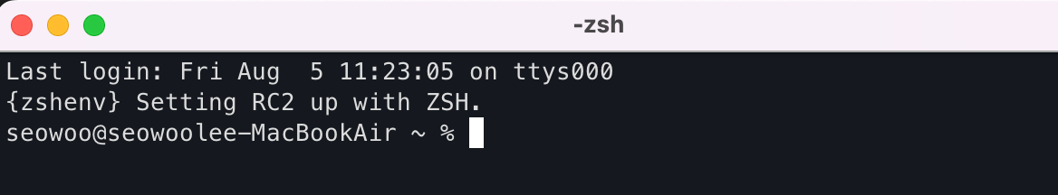 다시 터미널을 껐다 켜면 아래와 같이 테마가 없는 기본 터미널을 사용할 수 있다.