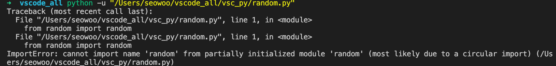 파이썬에는 random 라이브러리가 내장되어있으므로, 'random.py'처럼 파일명을 지으면 이 라이브러리와 혼동되어 오류가 나올 가능성이 있다.