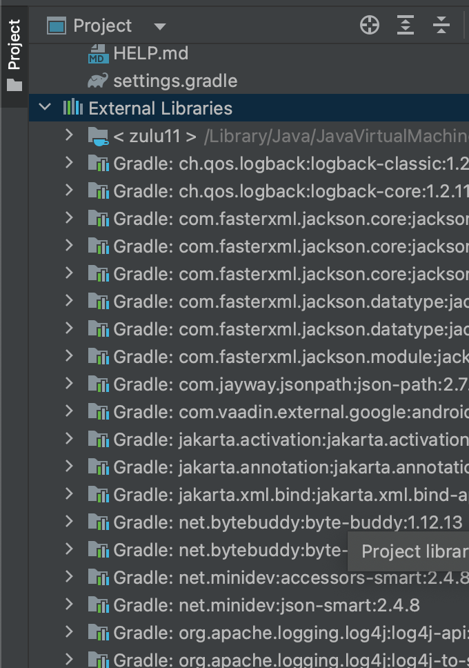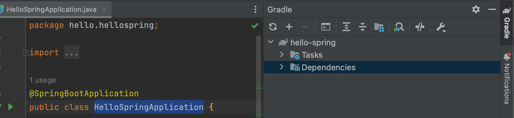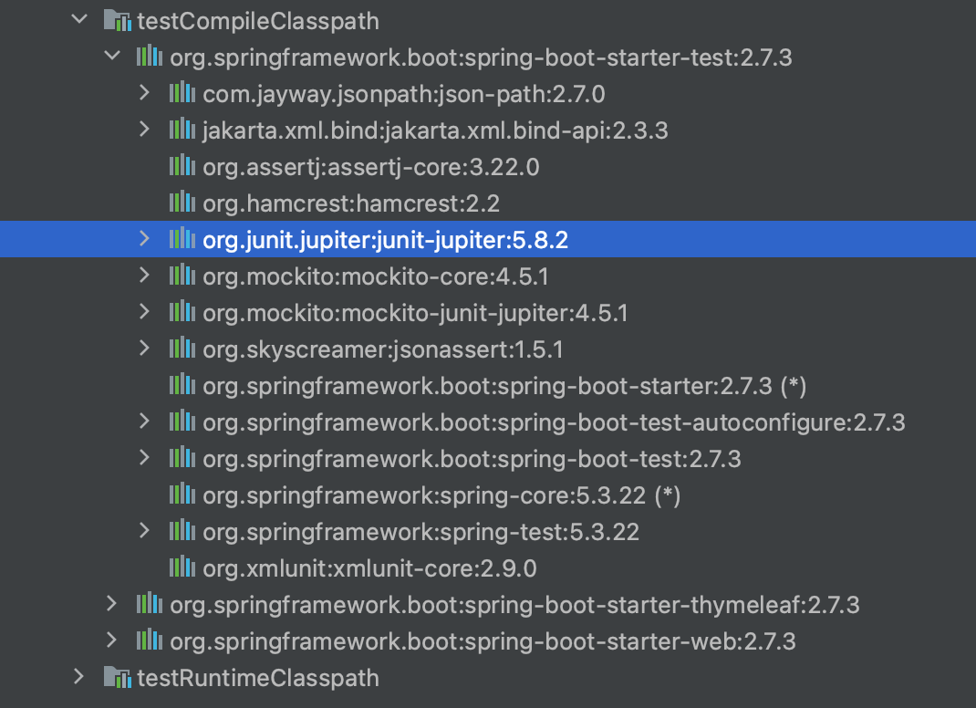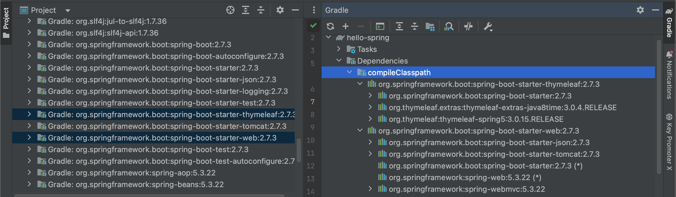 Gradle > project 명 (hello-spring) > Dependencies : 라이브러리 간 의존관계