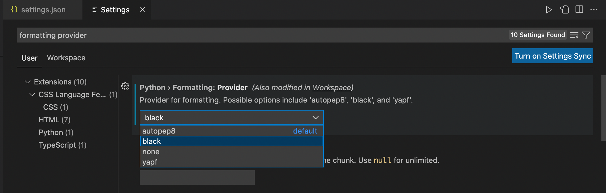 "python.formatting.provider": "black",