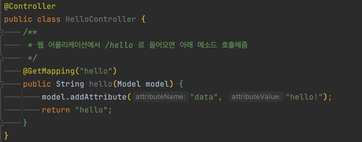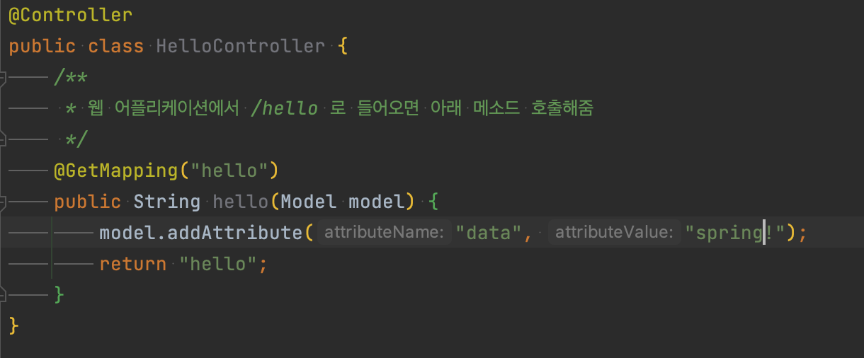 # model.addAttribute(key : "data", value : "hello!");