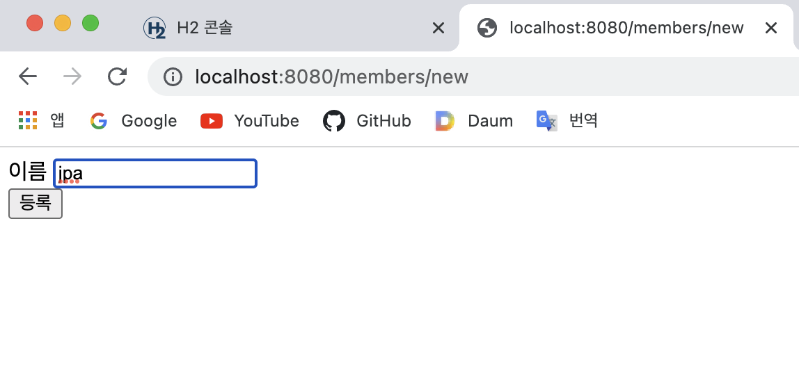 localhost:8080에서 h2db에 저장했던 회원 목록 확인